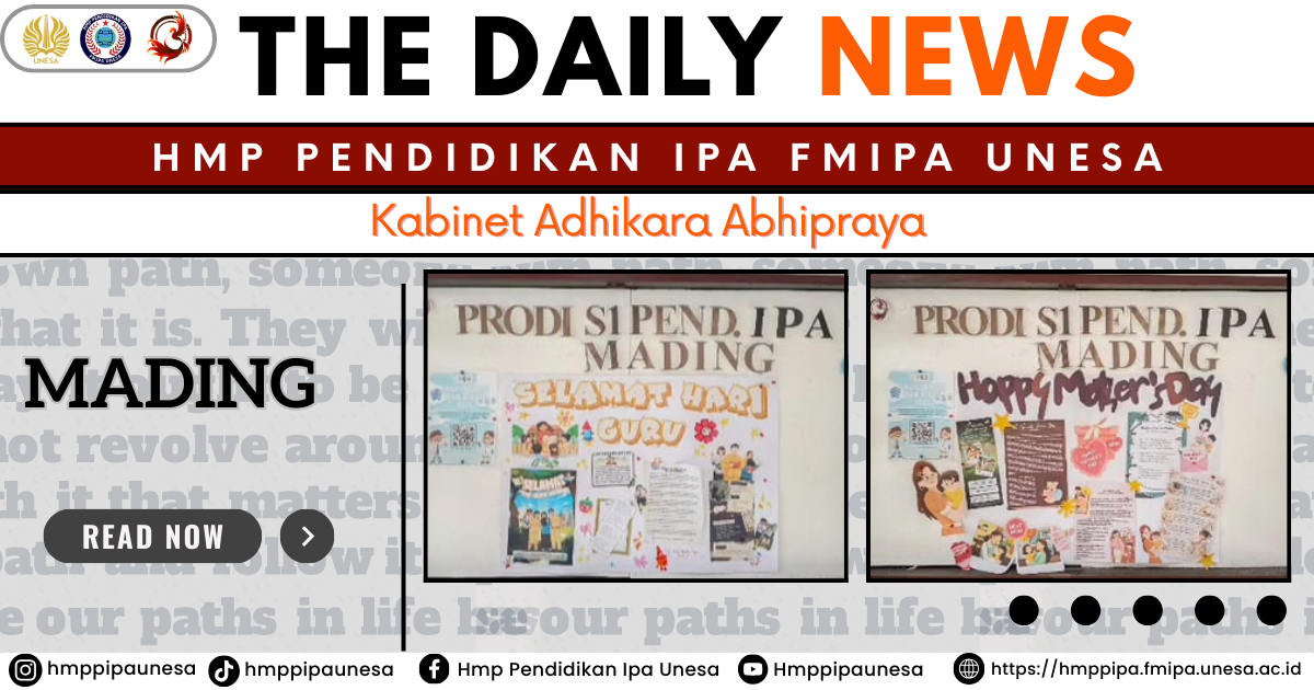Himpunan Mahasiswa Program Studi (HMP) Pendidikan IPA menghadirkan Mading sebagai salah satu media komunikasi yang berperan penting dalam lingkungan perkuliahan. Mading ini dirancang sebagai sarana pengemban