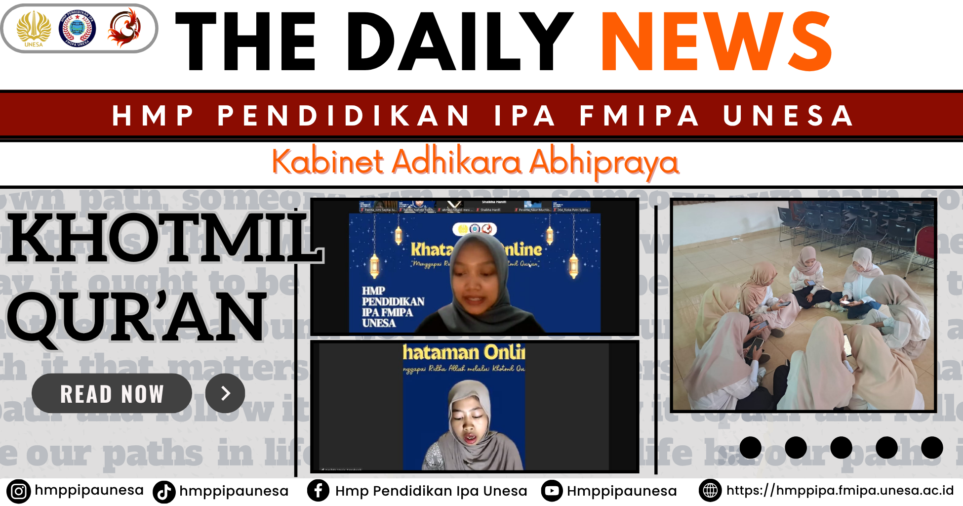 Khotmil Qur’an merupakan salah satu program kerja unggulan yang secara rutin diselenggarakan oleh Himpunan Mahasiswa Program Studi (HMP) Pendidikan IPA Fakultas Matematika dan Ilmu Pengetahuan Alam Universitas Negeri Surabaya setiap bulan Ramada