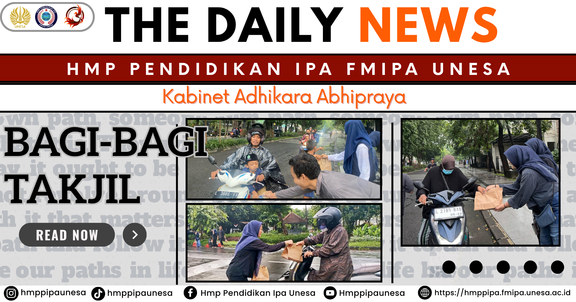 Himpunan Mahasiswa Pendidikan Ilmu Pengetahuan Alam (HMP Pendidikan IPA) Universitas Negeri Surabaya (UNESA) kembali menggelar kegiatan tahunan "Bagi Takjil" dengan tema “Indahnya Berbagi, Berkahnya Peduli di Bulan yang Suci” saat bulan Ramadh